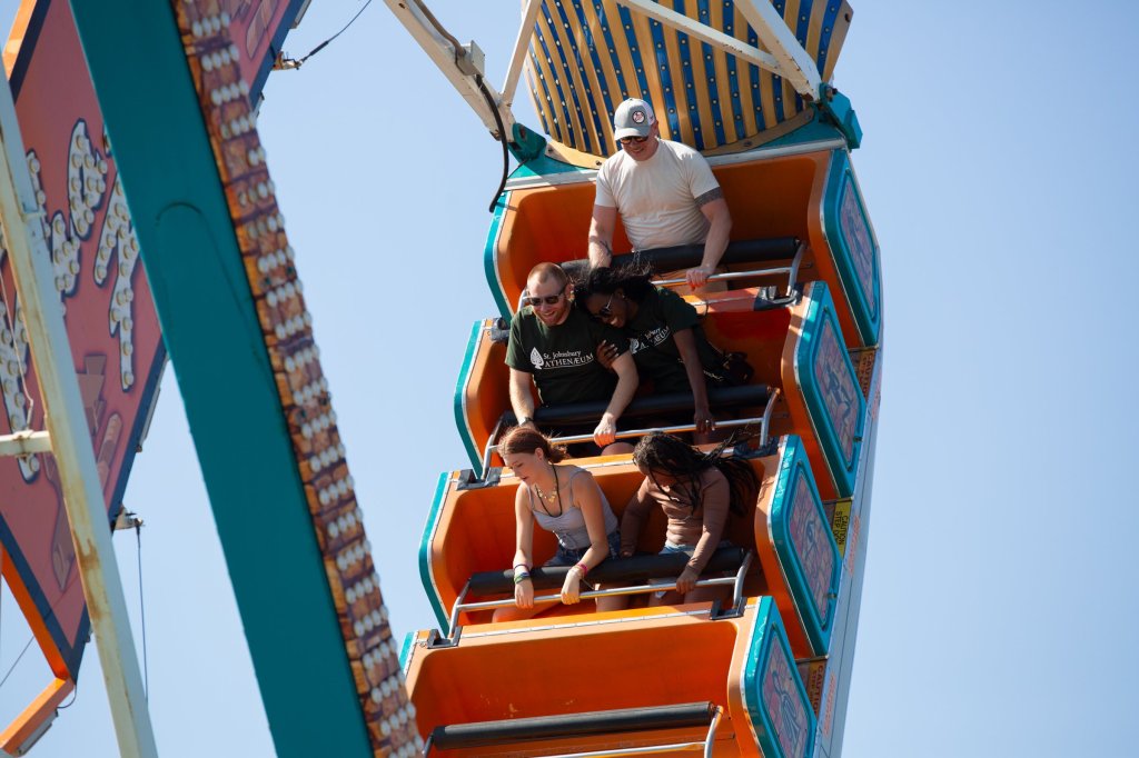 Balloon festival goers ride the “Pharoah’s Fury” pendulum ride near Simard-Payne Memorial Park on Saturday afternoon. Saturday evening’s balloon launch was later cancelled, marking the second cancellation of four scheduled launches at that point in the weekend. (Libby Kamrowski Kenny/Staff Photographer)