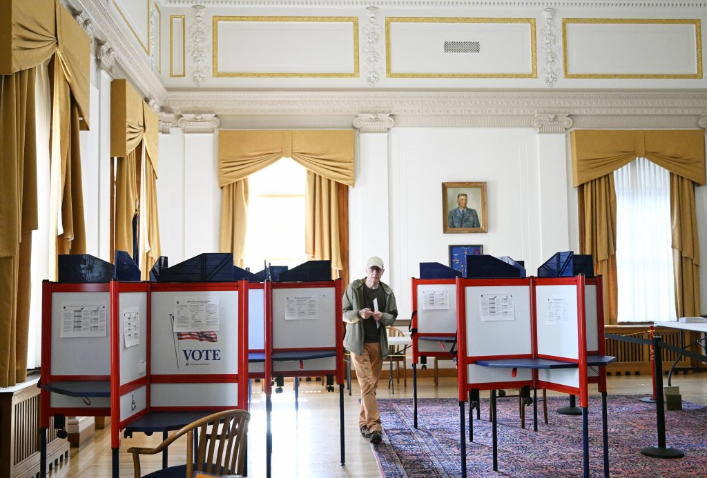 A voter emerges from the voting booths inside the State of Maine Room at Portland City Hall in October 2023 during in-person absentee voting. (Shawn Patrick Ouellette/Staff Photographer)