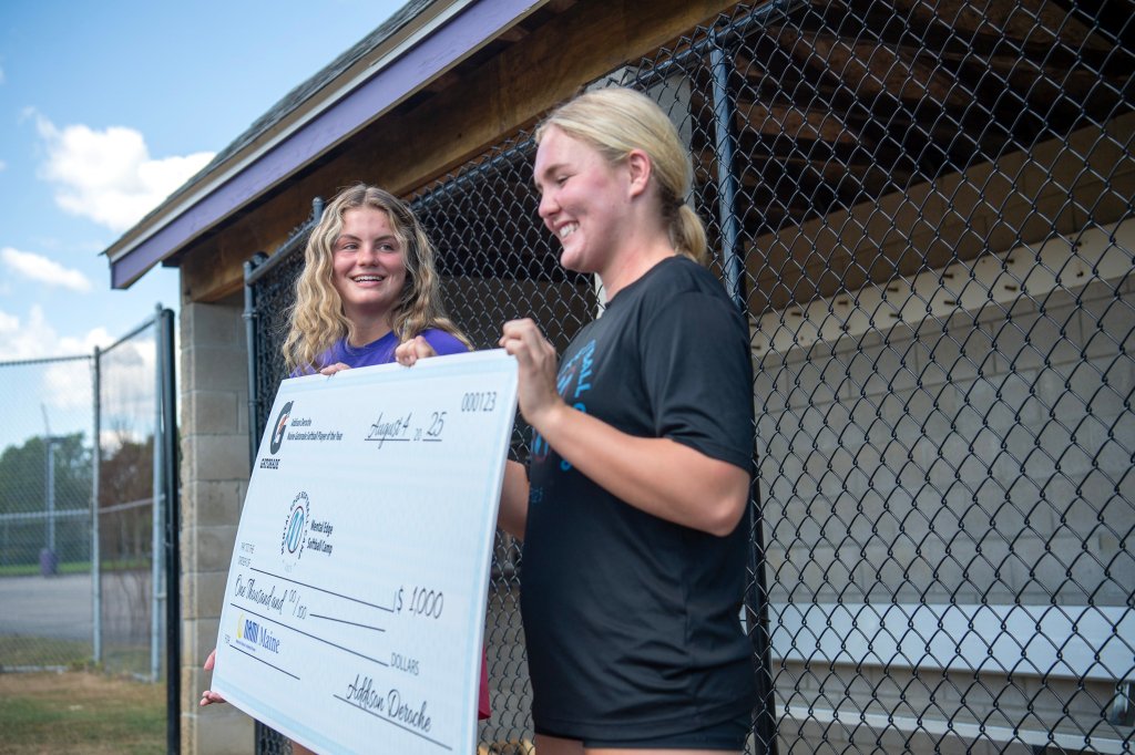 Cheverus pitcher Addison DeRoche, left, presents a check to Oakley McLeod that Gatorade donated in DeRoche’s name to the Mental Edge Softball Camp McLeod organizes. (Daryn Slover/Staff Photographer)