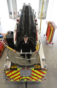 Ryan Johnston has taken over as the new fire chief at the Skowhegan Fire Department. Johnston, who started his duties Aug. 15, stands by a ladder truck Wednesday at the fire department in Skowhegan. (Rich Abrahamson/Staff Photographer)