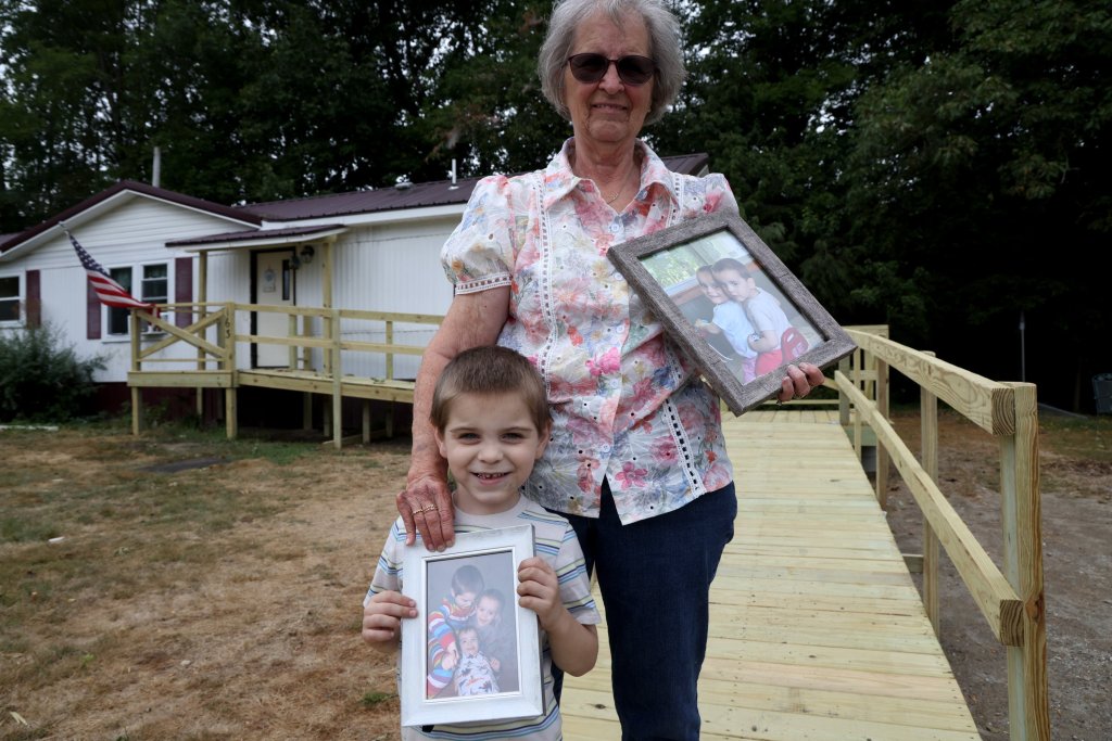 Martha Collins, a family friend, and Connor Bordeaux hold photos Monday of Bordeaux’s twin brothers who were killed in a hit-and-run crash in July. Collins and Connor, 6, stand on a new ramp at Collins’ home that was built by volunteers from Central Church of Augusta and China for the boys’ mother, Mollie Egold, who was injured in the accident and will return home from the hospital this week. (Anna Chadwick/Staff Photographer)