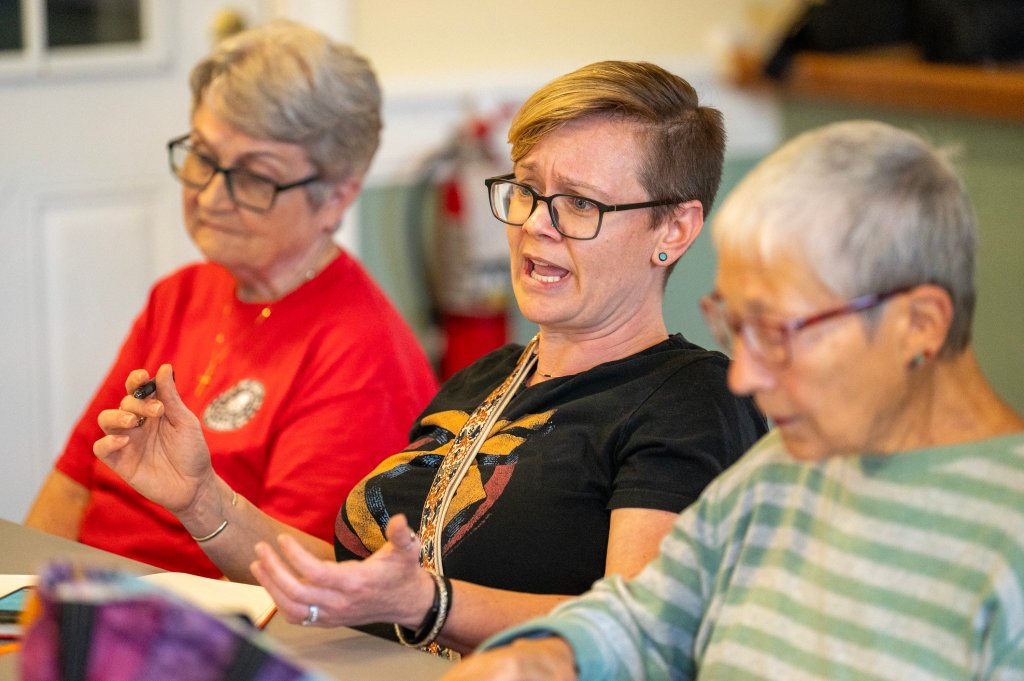 Lisa Roberts, center, speaks during a West Gardiner selectmen’s meeting Thursday in the town’s Auxiliary Hall in West Gardiner. (Joe Phelan/Staff Photographer)