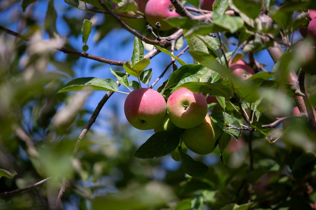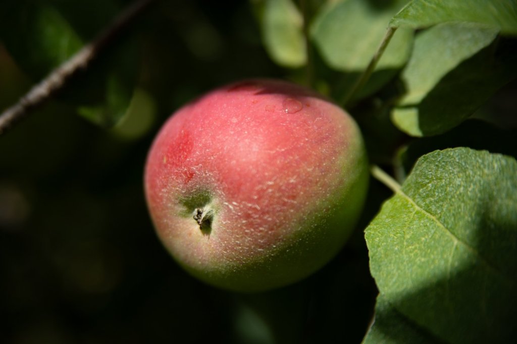 An apple peeks out from the shade as it grows at Royal River Orchards in New Gloucester on Saturday. The 250-acre family-owned farm allows visitors to pick their own apples by the bag instead of by weight, and is open Saturdays and Sundays through mid-October this season. (Libby Kamrowski Kenny/ Staff Photographer)
