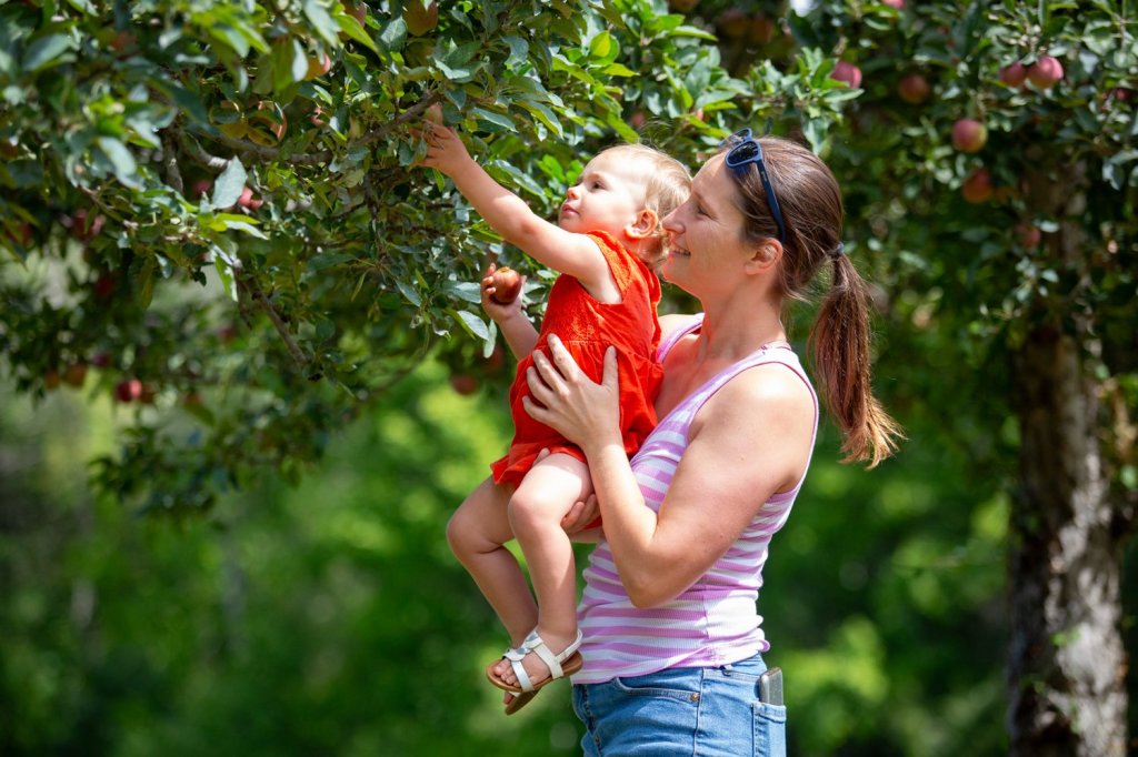 At another apple tree, Hannah and Andy Goodine watched as their children, Lucas, 4, and Claire, 18 months, excitedly reached for apples. It was the family’s first time apple picking in Maine after recently relocating from Texas.