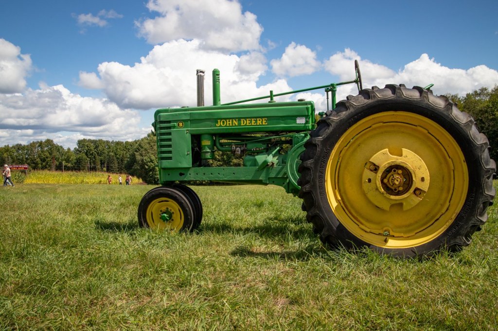 A John Deere tractor is parked in a field during opening day at Royal River Orchards in New Gloucester on Saturday. The 250-acre family-owned farm allows visitors to pick their own apples by the bag instead of by weight, and is open Saturdays and Sundays through mid-October this season. (Libby Kamrowski Kenny/ Staff Photographer)