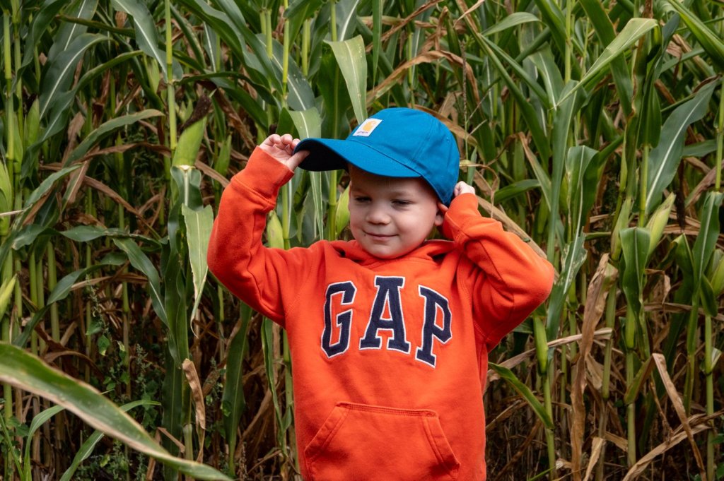 Elijah White, 3, adjusts his hat before forging on in the corn maze with his mom, Emily Remillard, at Royal River Orchards in New Gloucester on Saturday. The family-owned farm and its attractions are open Saturdays and Sundays through mid-October this season. It is located at 201 Peacock Hill Road. (Libby Kamrowski Kenny/ Staff Photographer)
