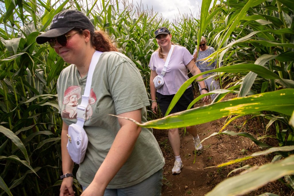 Visitors walk through the corn maze during opening day at Royal River Orchards in New Gloucester on Saturday. The 250-acre family-owned farm allows visitors to pick their own apples by the bag instead of by weight, and is open Saturdays and Sundays through mid-October this season. (Libby Kamrowski Kenny/ Staff Photographer)