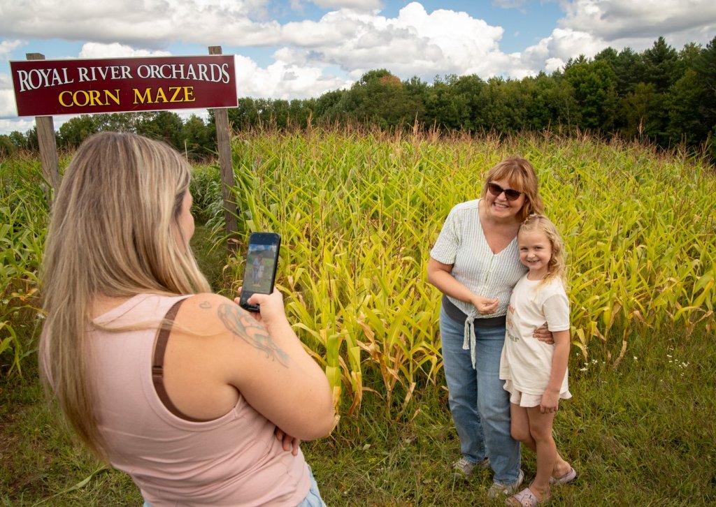 At the entrance of the corn maze, Melissa Dubie posed with her granddaughter Scarlett Parady, 7, as Stephanie Parady took their photo. The family was visiting Royal River Orchards to celebrate Dubie’s birthday.