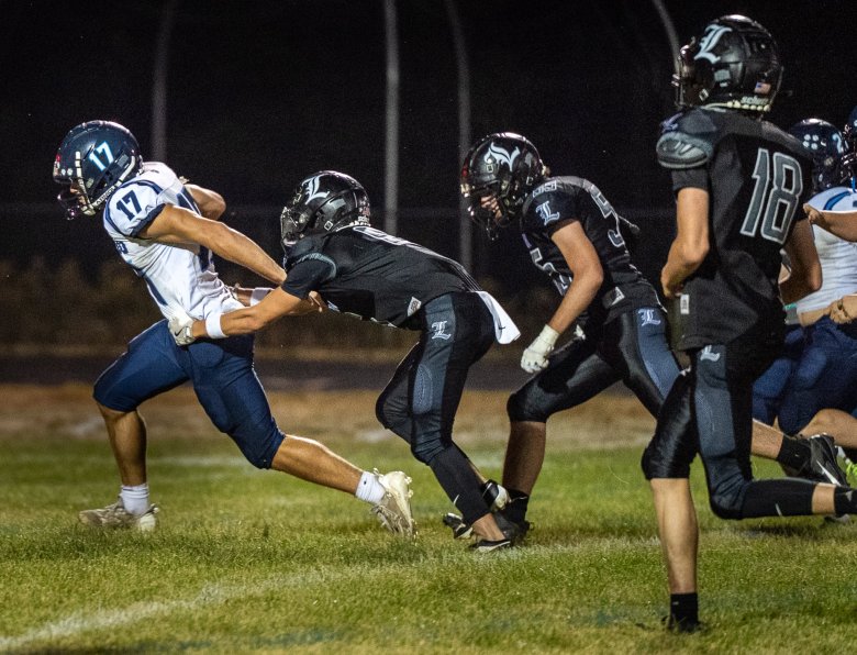 Senior left tackle Hunter Ladd, a co-captain with Beauimer, led Lisbon’s march to and onto the field. Ladd carried the team’s flag, black with a script L. He waved the flag as the team ran to midfield, where he planted it with authority.
