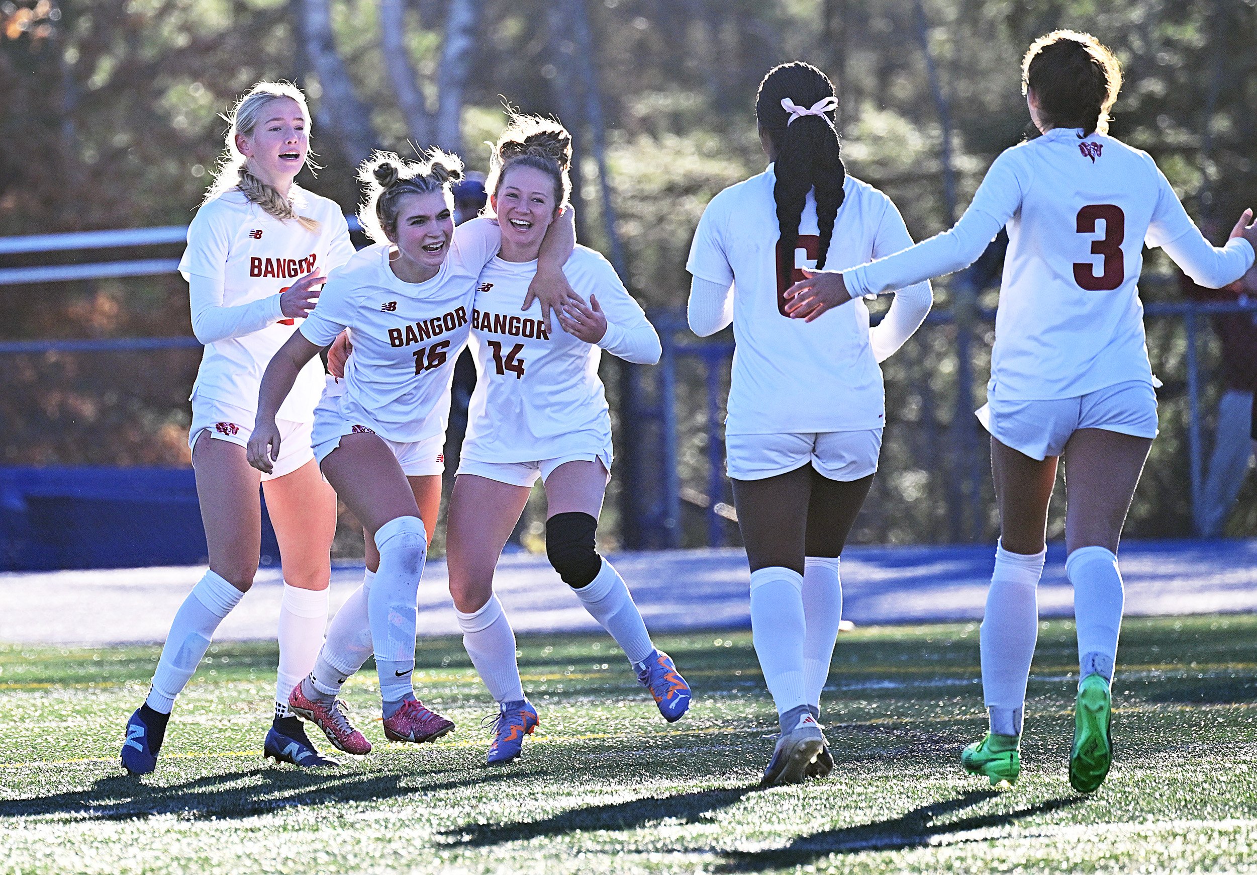 Bangor celebrates after a goal by Georgie Stephenson, second from left, during the 2024 Class A state final against Scarborough. (Shawn Patrick Ouellette/Staff Photographer)