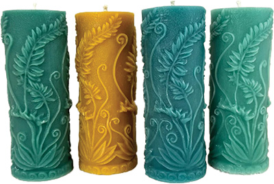 Made in Hope with plant-based dyes, these long burning, 100% beeswax candles are dripless, smokeless and have a heavenly honey scent. 2.5 inches wide by 6.5 inches high.