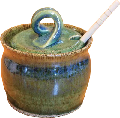 Made in Vermont, this wheel thrown, glazed pot comes with a wooden dipper, lid and holds about a pint of honey. Dishwasher and microwave safe, 3.5 inches high by 4.5 inches high.