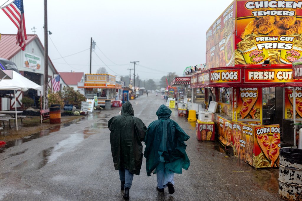 People wear ponchos to protect from the pouring rain while walking through vendors at the Cumberland Fair on Thursday. (Brianna Soukup/Staff Photographer)