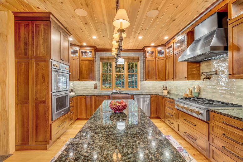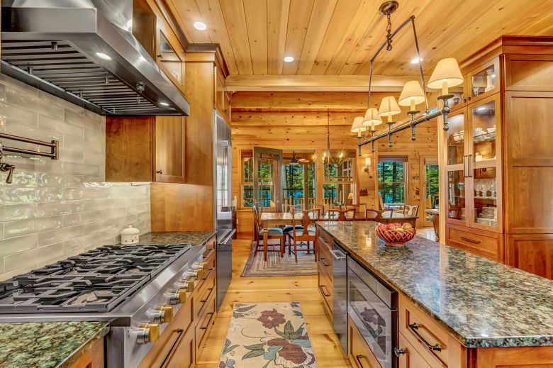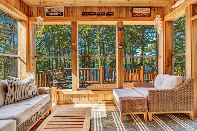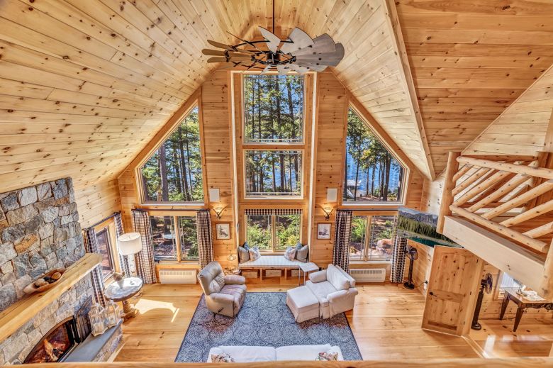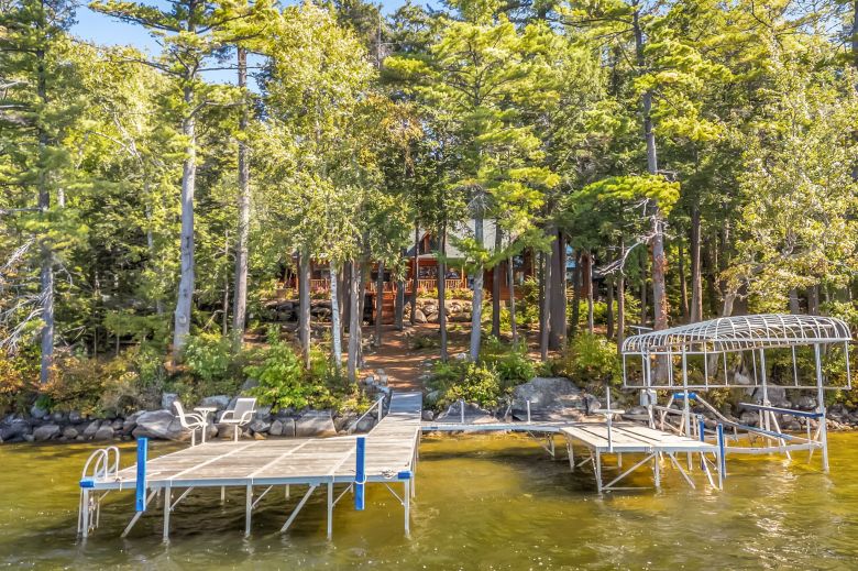 Masterfully crafted with impeccable taste and high-end finishes throughout, this Adirondack-style home offers complete privacy on a 1.95-acre lot with 257′ of bold, deep water lakefront, featuring nightly sunsets on one of central Maine’s best lakes.