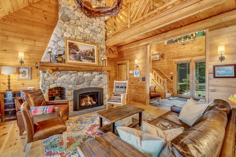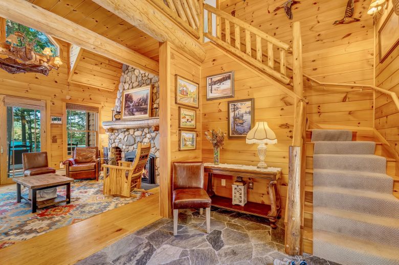 As you walk-in the formal entry, you will be immediately greeted by the lake views that frame the living room. Featuring a grand stone fireplace, chandelier and lofty cathedral ceilings, this central gathering place is overlooked by a second-floor catwalk. A lovely sun room opens to the expansive lakeside deck, where a large staircase takes you down to the yard and waterfront.