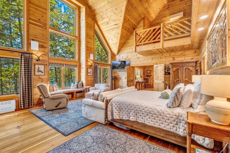 The primary bedroom suite is housed in its own luxurious wing, featuring a wall of water facing windows, a fireplace and private dressing room with built-in storage and a make-up station. Live the spa-life in the ensuite bathroom with soaking tub and walk-in shower. A second level loft is perfect for your personal home gym. At the other end of the home is a secondary bedroom suite with a laundry room. The full bathroom has a walk-in shower and soaking tub. Upstairs are two more ensuite guest bedrooms, still with more lake views.
