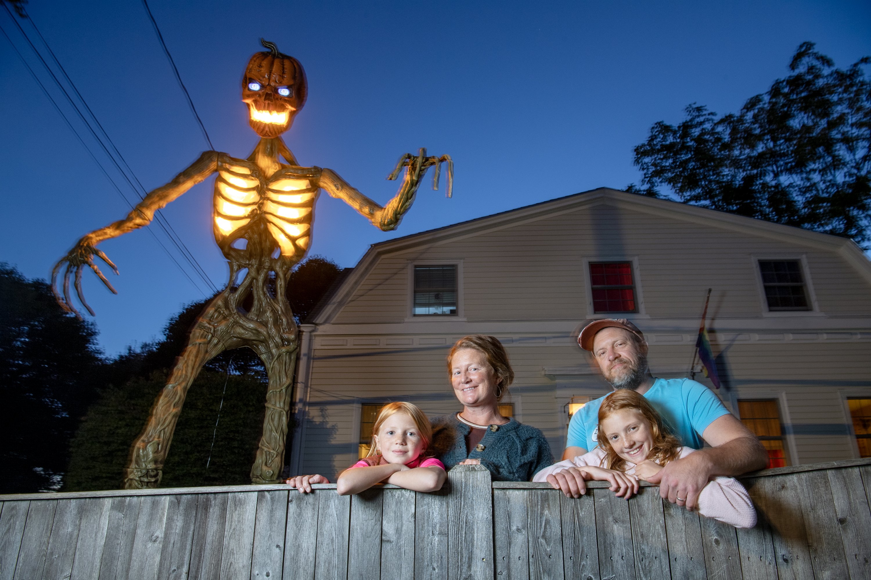 The Morse’s skeleton is a deluxe 12-footer, with flashing lights in the chest and in the pumpkin head. Their house is on busy Route 77 and the skeleton is so big that the head can be seen from the windows upstairs, where 10-year-old Molly and 8-year-old Piper sleep.