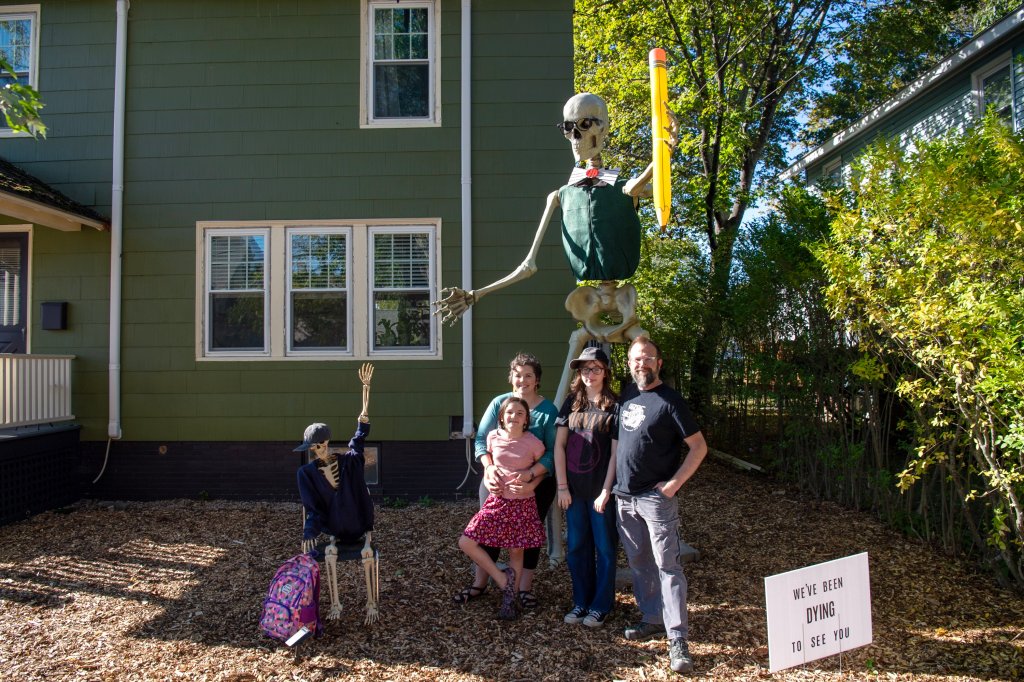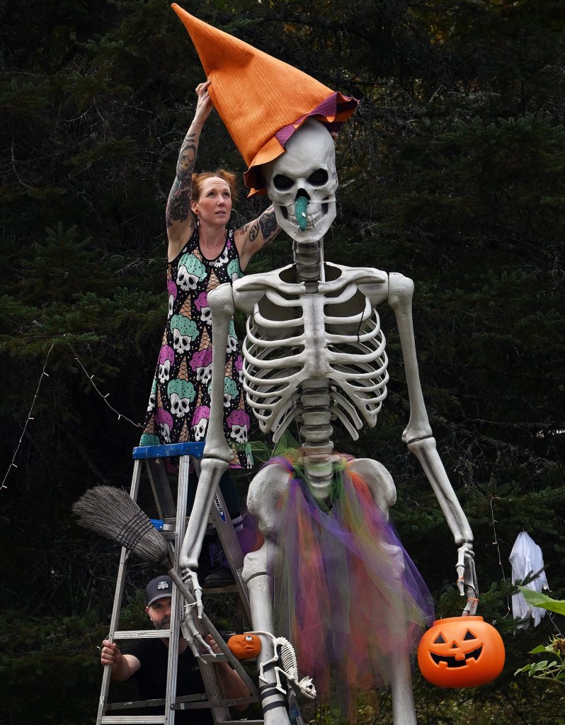 Somerman works as small business consultant, and dressing Skelly has become a creative outlet for her. Before Skelly, she didn’t do any outdoor Halloween decorating. But once she started to see giant skeletons on social media, with definite personalities and eye-catching outfits, she told her fiancé and their two children that she really wanted one. On a trip to Home Depot last year, they brought one home to her.