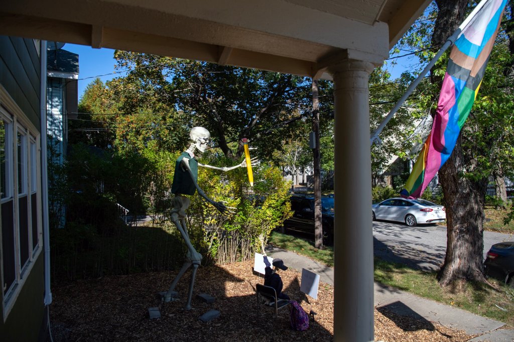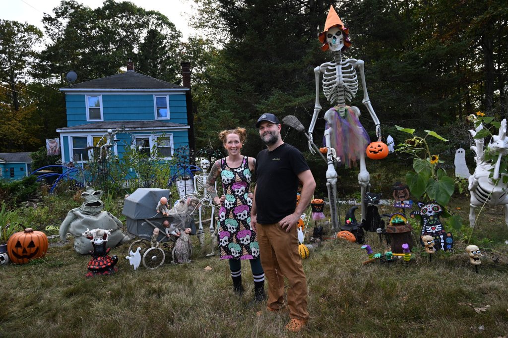 Emily Curry has a 10-foot skeleton in front of her house on busy Broadway in South Portland, near Route 1. In her take on the “Where’s Waldo?” children’s book series, the skeleton in September was wearing a striped jersey and was partially hidden by trees and bushes. So it was not likely to fly away. Waldo had plenty of company, too, as Curry had dressed a half-dozen person-sized skeletons as Disney princesses along her fence, and scattered other skeletons around her yard.
