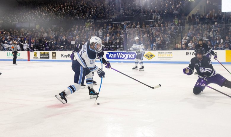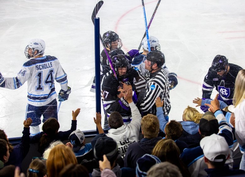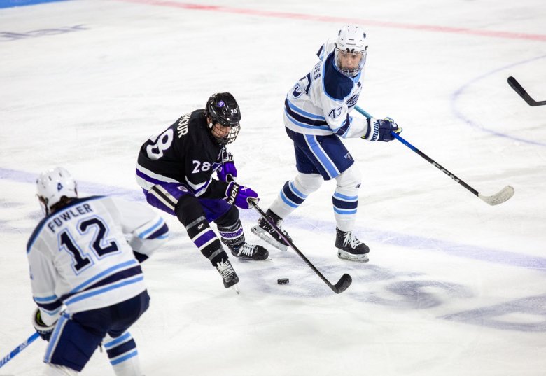 Poirier’s first goal was the result of that hard work. When his initial shot rebounded off the right pad of Holy Cross goalie Connor MacKenzie, Poirier skated hard to the front of the net to get to the puck and score for a 2-0 lead at 5:56 of the second period.