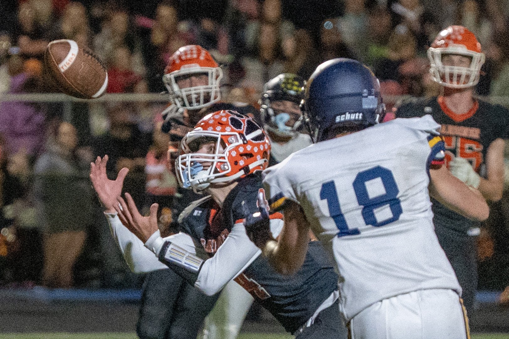 Gardiner wide receiver Brayden Elliott, left, catches a pass that was tipped by Medomak Valley linebacker Grayson Downing, right, before scoring a touchdown Oct. 3 at Hoch Field at Gardiner Area High School in Gardiner. (Joe Phelan/Staff Photographer)