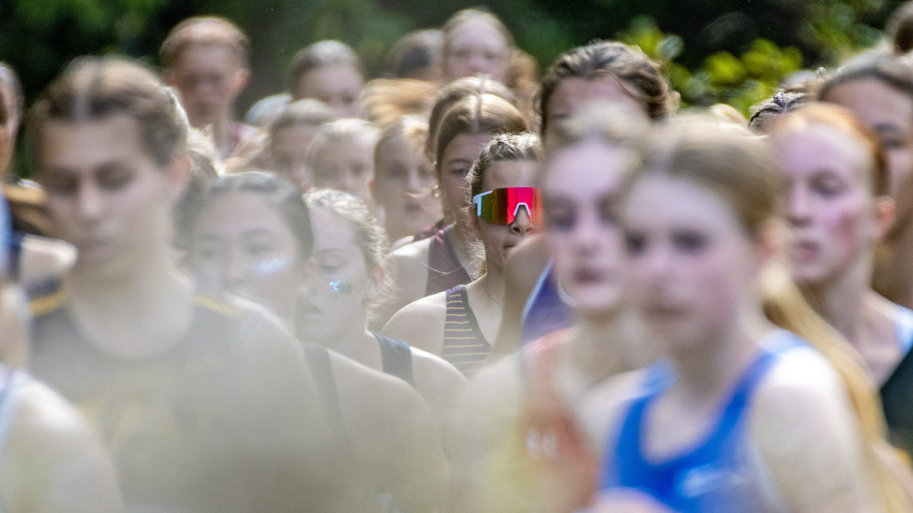 The pack in the girls seeded race runs through the woods Oct. 4 at the Festival of Champions in Belfast. (Joe Phelan/Staff Photographer)
