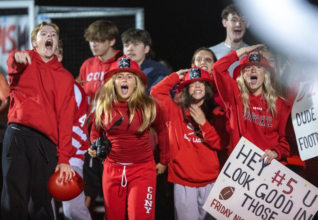 Cony fans celebrate after a touchdown during the Rams’ 53-7 win over Fryeburg on Oct. 3 in Augusta. (Russ Dillingham/Staff Photographer)