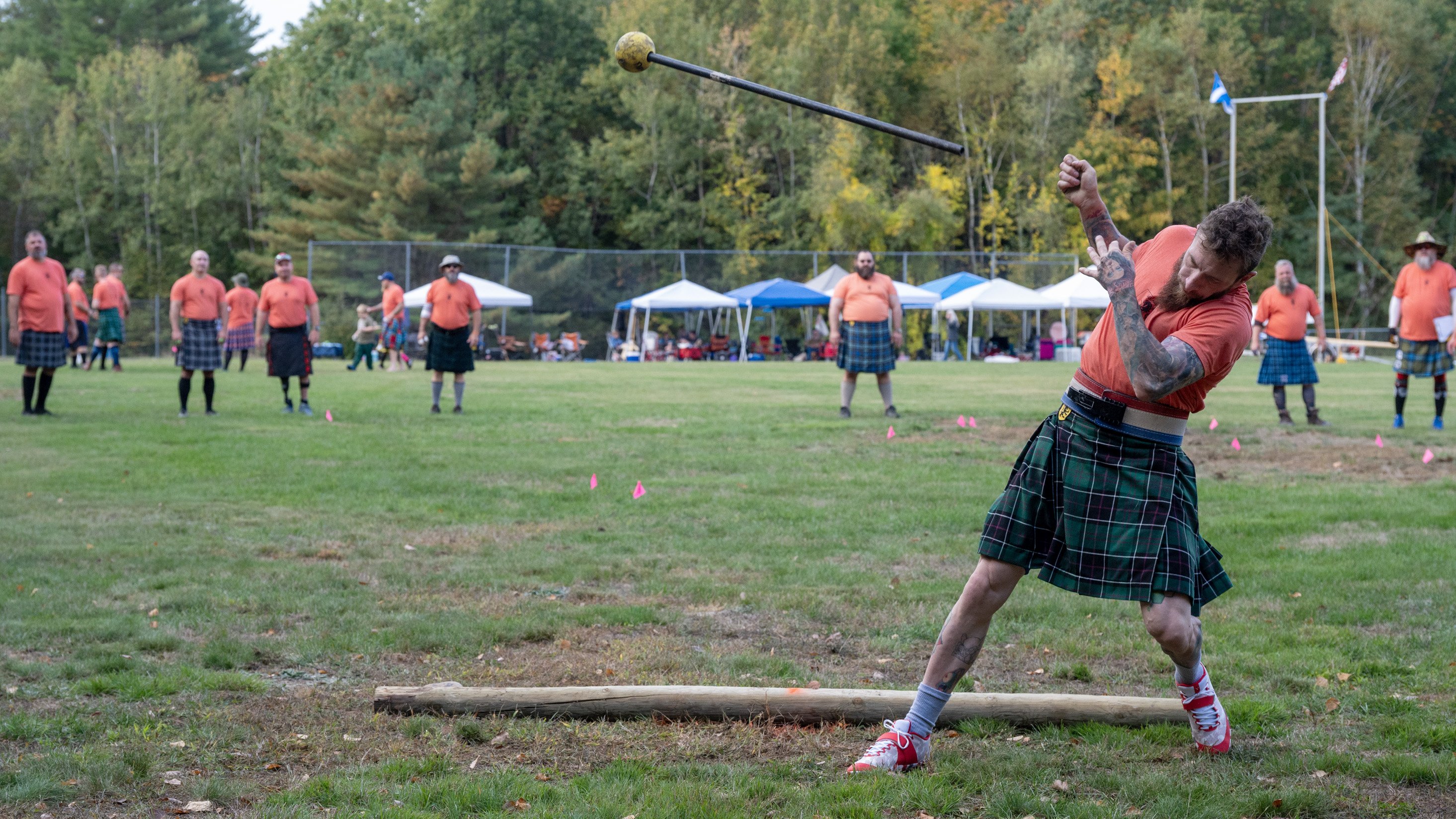 Other competitors watch Oct. 4 as Waterville’s Teejay Sinclair throws the hammer during the Hallowell Backyard Games. (Joe Phelan/Staff Photographer)