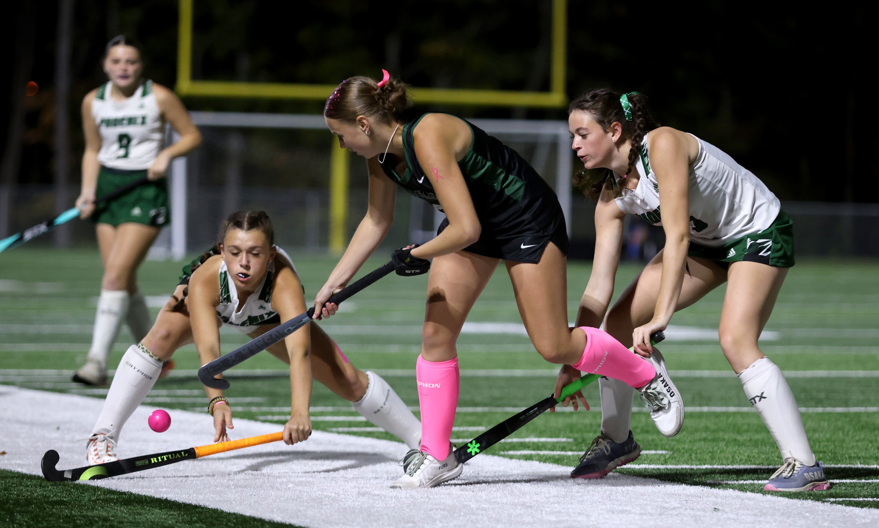 Winthrop’s Raegan Littlefield makes a pass over Spruce Mountain’s Elyssa Yannelli’s stick as Spruce’s Ava Davis helps defend Oct. 8 in Winthrop. (Anna Chadwick/Staff Photographer)