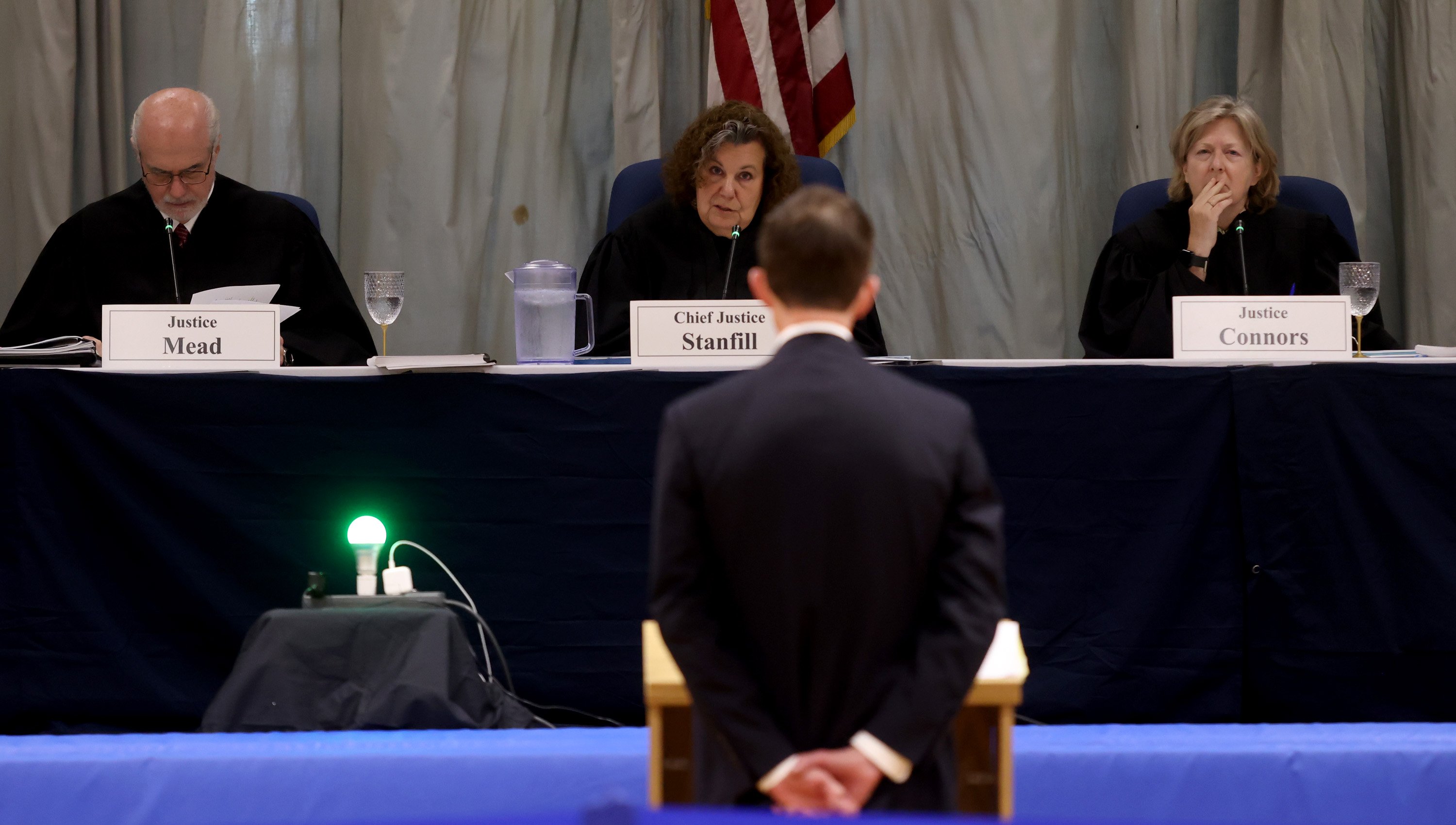 Chief Justice Valerie Stanfill questions Assistant Attorney General Sean Magenis at Upper Kennebec Valley High School in Bingham. The Maine Supreme Judicial Court heard oral arguments Oct. 7 from attorneys for the state and the American Civil Liberties Union of Maine. (Anna Chadwick/Staff Photographer)
