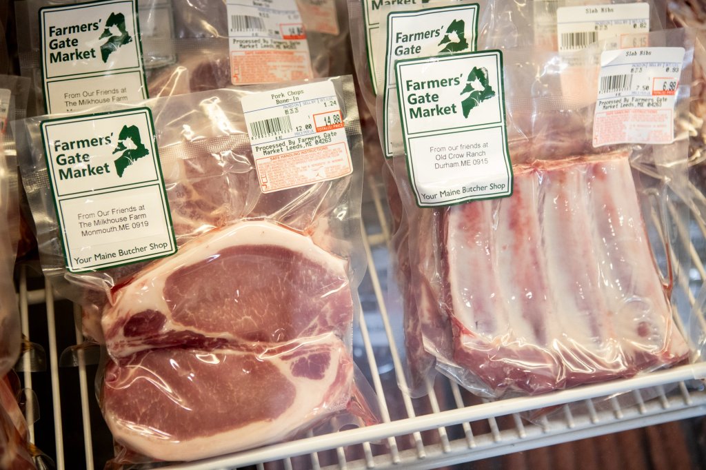 Bone-in pork chops from Monmouth-based The Milkhouse Farm and ribs from Old Crow Ranch in Durham are seen Sept. 30 in a refrigerator at Farmers’ Gate Market off Route 106 in Leeds. (Libby Kamrowski Kenny/Staff Photographer)