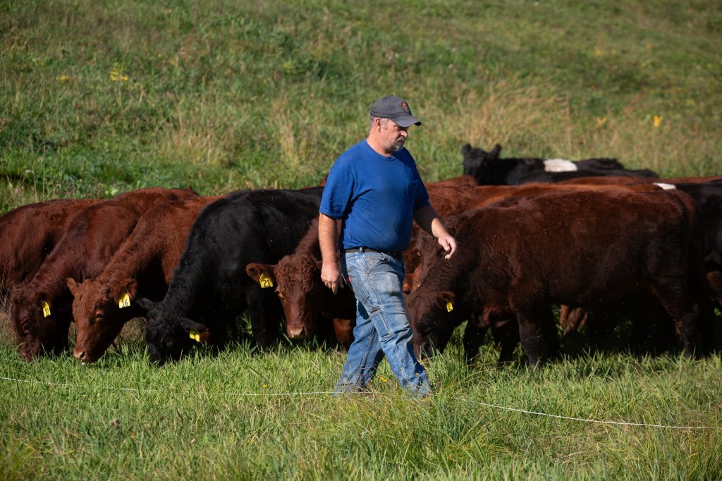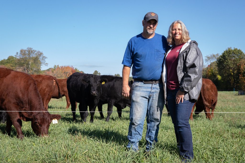 Aaron and Rebecca Buckley breed and raise cattle on their 500-acre farm in Leeds. Aaron said they’ve gone through a lot of stress and anxiety over raising beef prices. (Libby Kamrowski Kenny/Staff Photographer)