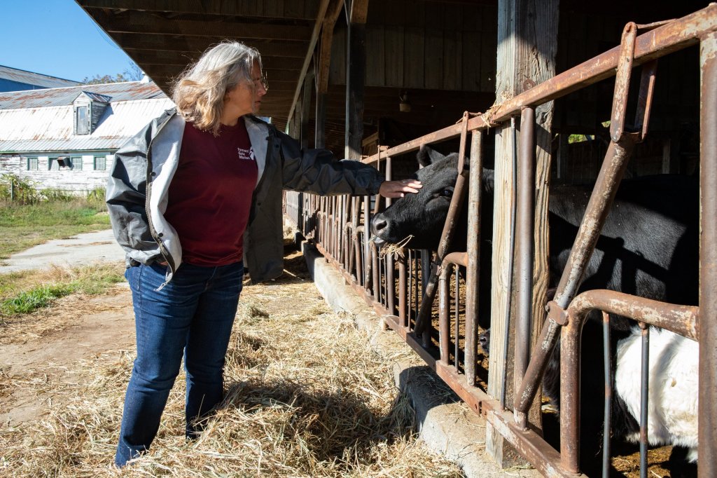 Rebecca Buckley pats a mother cow Sept. 30 at Buckley Farms in Leeds. The farm is about 500 acres and the cattle are grass fed for about nine months of the year before being put in the barn for winter. (Libby Kamrowski Kenny/Staff Photographer)