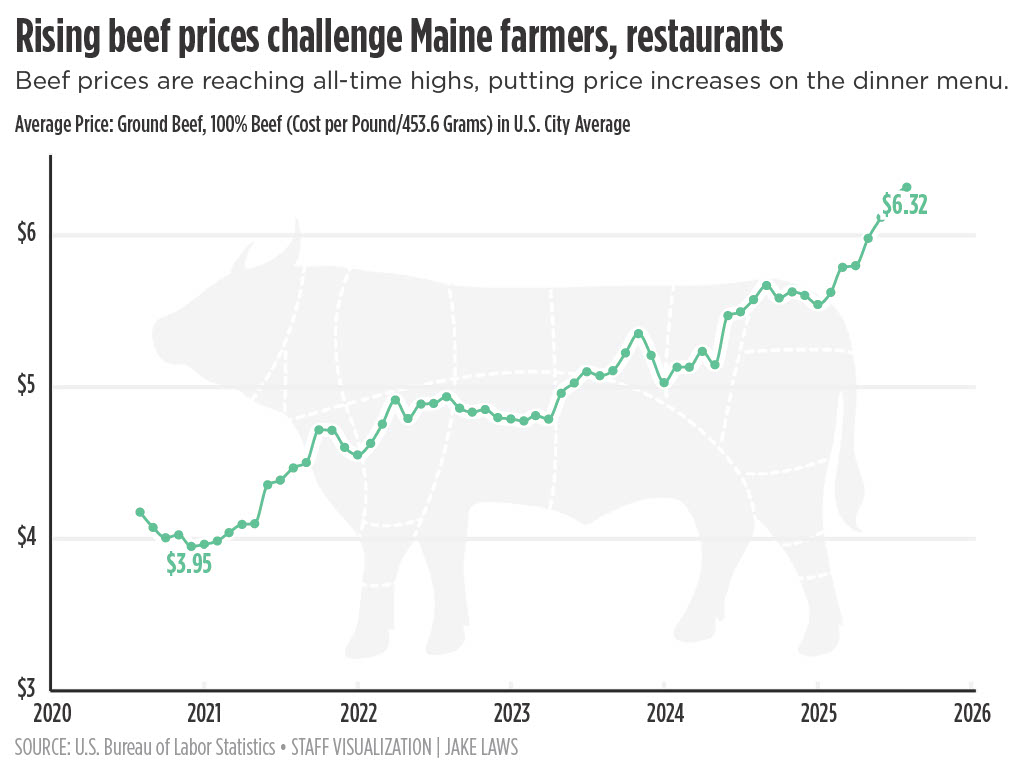 Sinisi and his wife, Seren, who have been raising cattle for 19 years, are among the Maine farmers and restaurants struggling with the steadily rising price of producing beef.