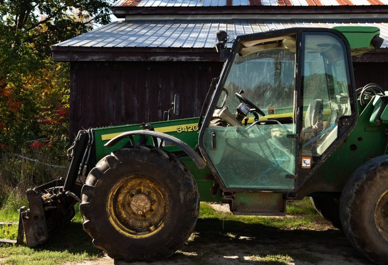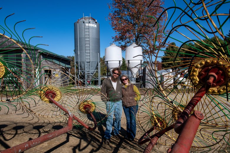 Steve and Seren Sinisi stand behind haying equipment Oct. 2 at their Old Crow Ranch in Durham. Having raised cattle for 19 years, they are among the Maine farmers and restaurants struggling with the steadily rising price of producing beef. (Russ Dillingham/Staff Photographer)