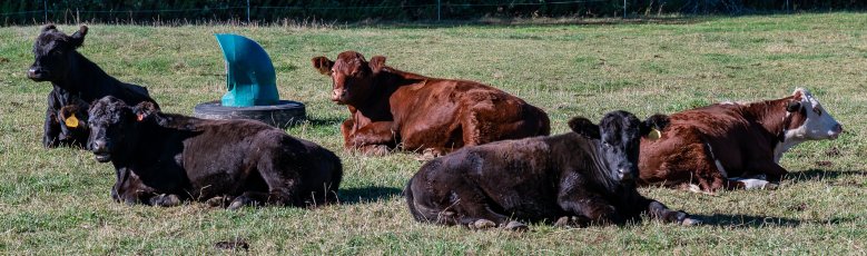 Red and Black Angus mixed with Hereford beef cattle graze in a field Oct. 2 at Old Crow Ranch on Davis Road in Durham. (Russ Dillingham/Staff Photographer)
