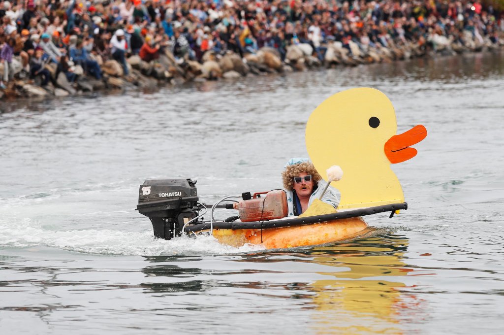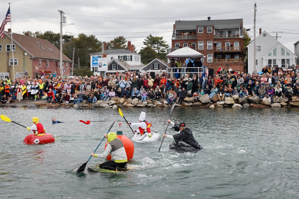 The most notable event is the pumpkin boat regatta, in which contestants race carved-out pumpkins weighing between 500 and 800 pounds around buoys on the Damariscotta River. Steering their organic crafts and racing in heats of either motorized or paddle-powered, contestants go out and back from a dock, knocking each other like bumper cars to the cheers of the crowd.