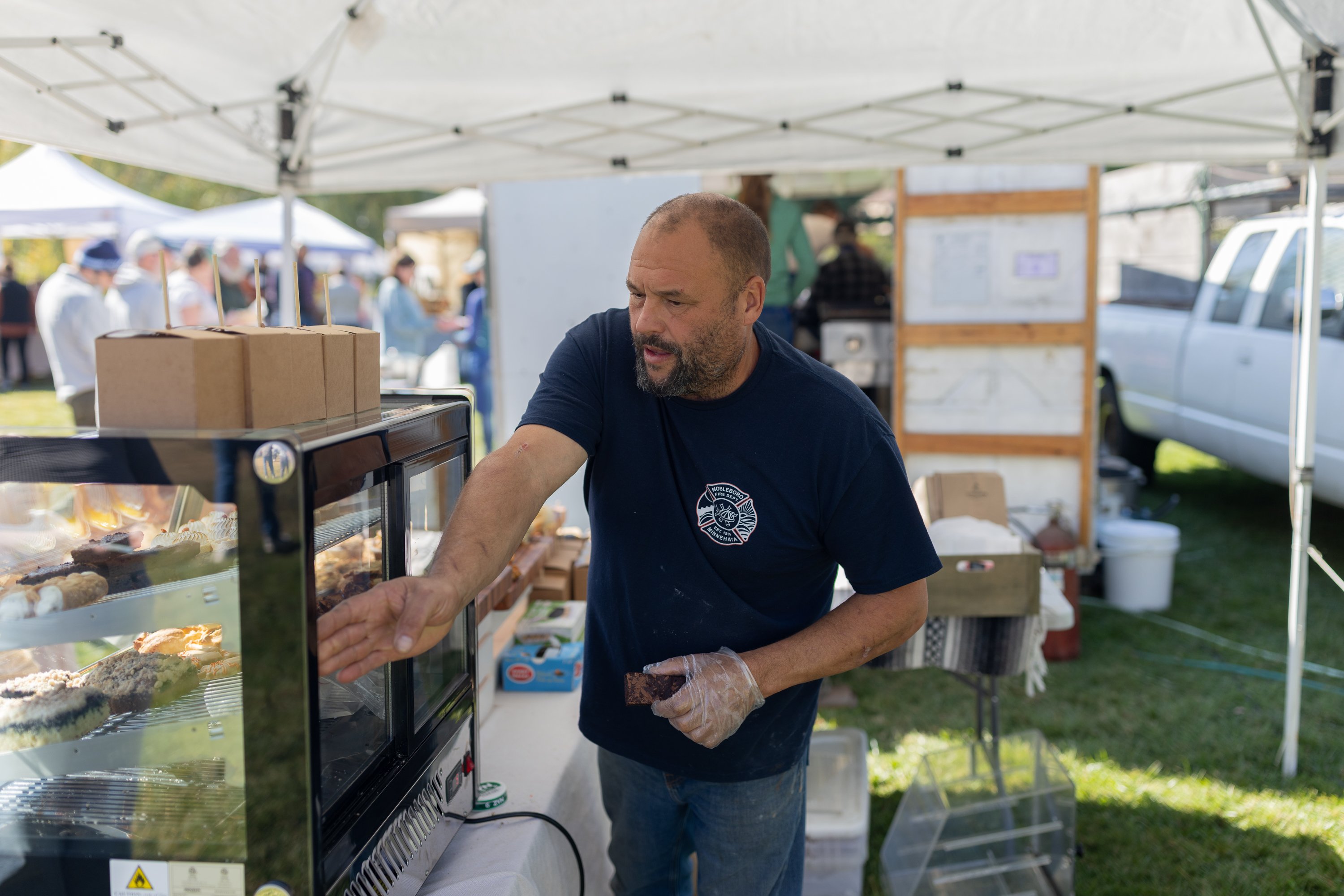 Jay Hopkins from Wildwoods Bakery in Nobleboro sells pastries at the Fall Foliage Festival at the Boothbay Railway Village Museum on Saturday, October 11, 2025. (Brianna Soukup/Staff Photographer)