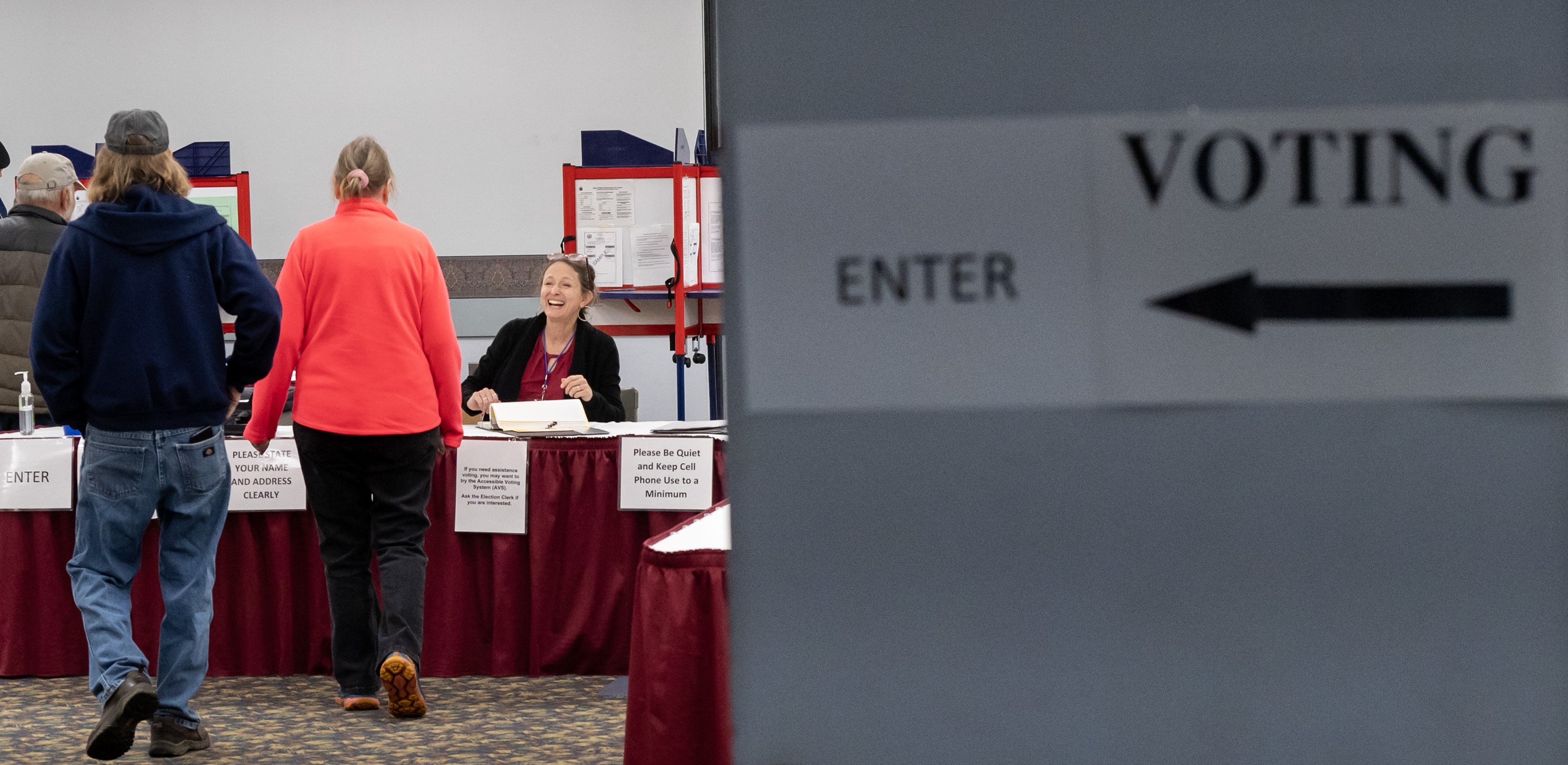 Election worker Joy McKenna, right, greets Ward 3 voters November 2023 at the Augusta Civic Center. (Joe Phelan/Kennebec Journal)