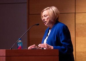 Gov. Janet Mills delivers opening remarks at USM in Portland on Tuesday night at a forum on the rule of law held by the Maine Lawyers for the Rule of Law. (Gregory Rec/Staff Photographer)