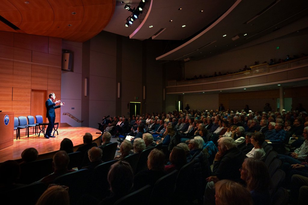 Harvard Law Professor Noah Feldman, an expert on constitutional law, delivers the keynote speech on the rule of law during a forum held at the University of Southern Maine in Portland Tuesday night by the Maine Lawyers for the Rule of Law. (Gregory Rec/Staff Photographer)