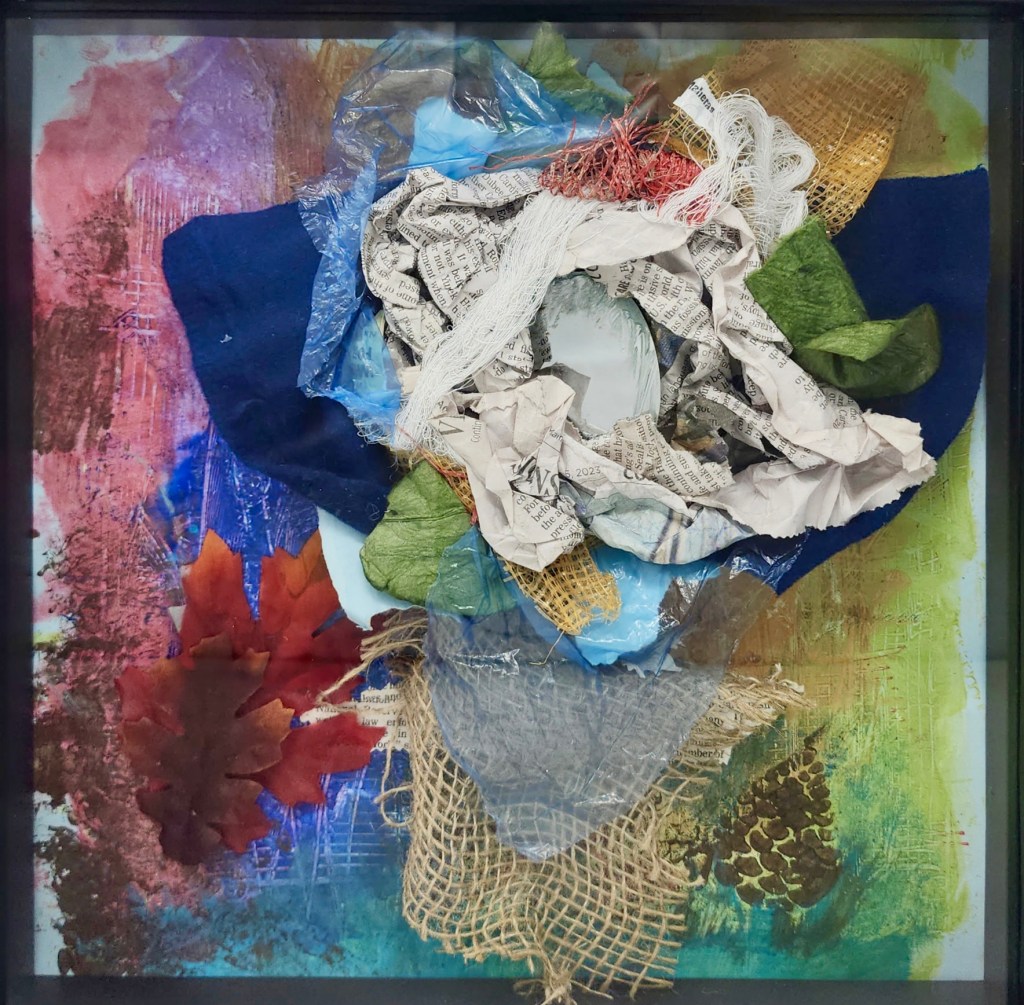 Ames curated the exhibit with Meryl Troop, a longtime colleague and ASL interpreter. An artist herself, Ames also made a piece for the show. “Unwrapping” is a mixed media work with layers of paste paper, burlap, newspaper clippings from the shooting, fabric and other materials.
