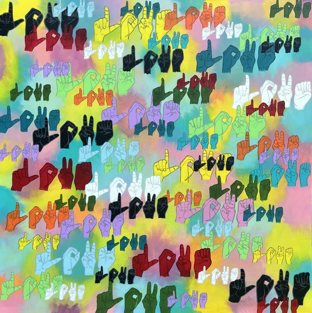 Now, the squares are sewn together. They greet visitors to the gallery with a sign in ASL: “I love you.”