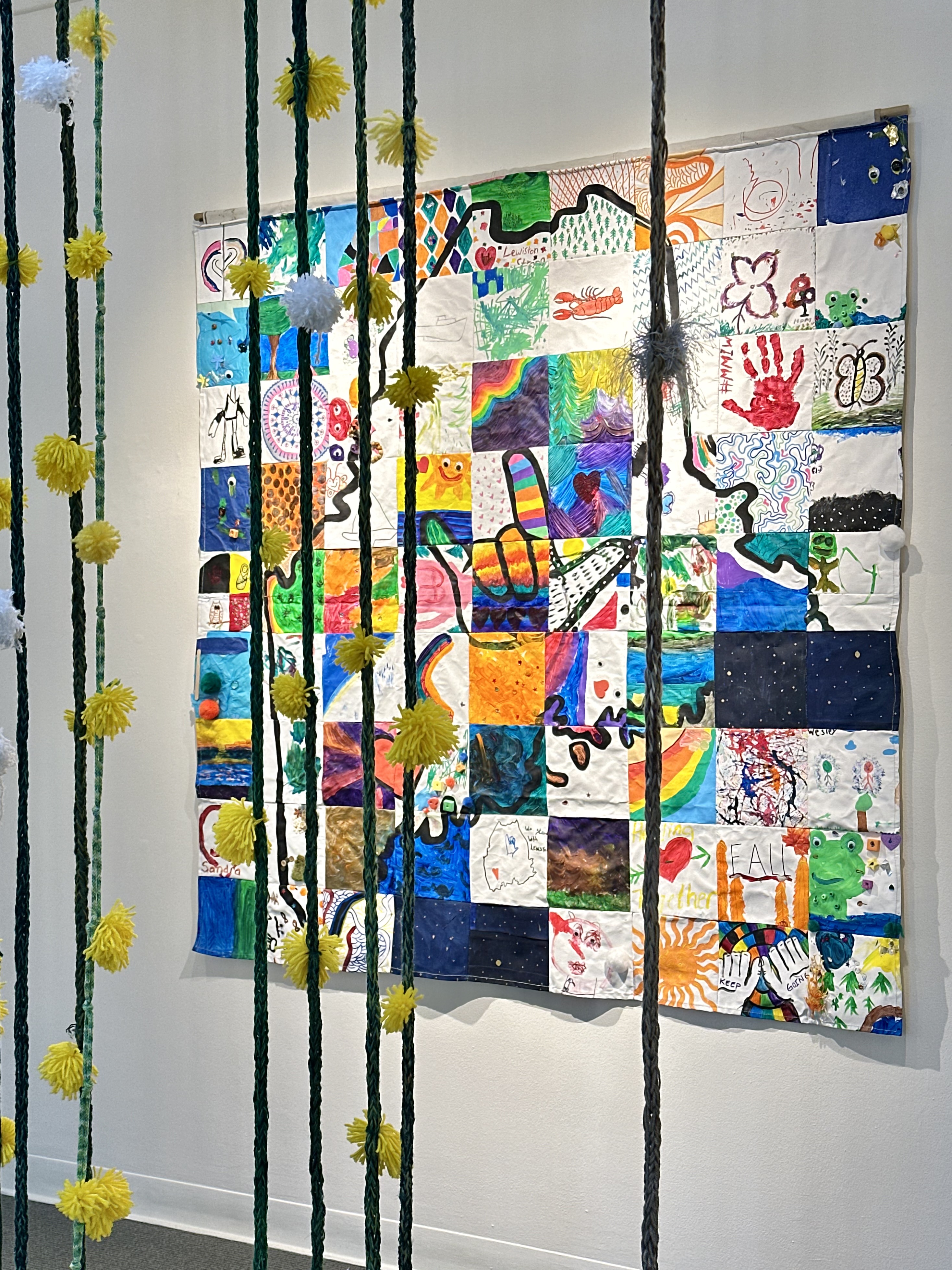 Now, the squares are sewn together. They greet visitors to the gallery with a sign in ASL: “I love you.”