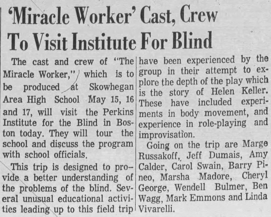 The Skowhegan Area High School cast of “Miracle Worker” is published in a Morning Sentinel news article May 10, 1974. (Newspapers.com)