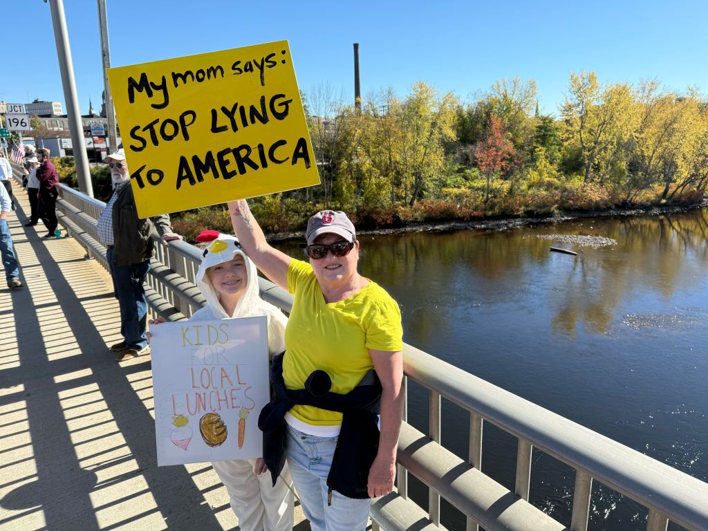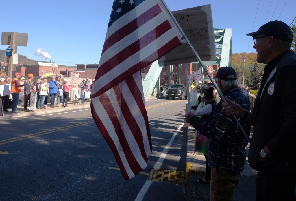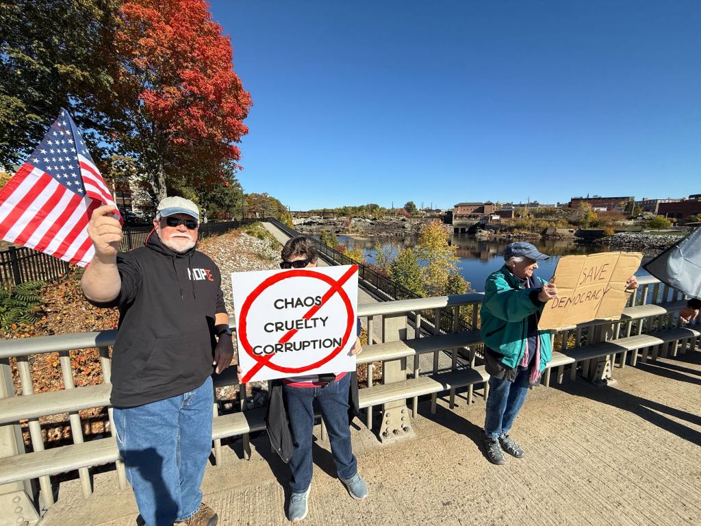 More than 100 River Valley residents turned out Saturday at the Morse Bridge on 108 Bridge St. in Rumford for the “No Kings” protest. There was one incident where a passerby threw water bottles from his truck at the protesters.