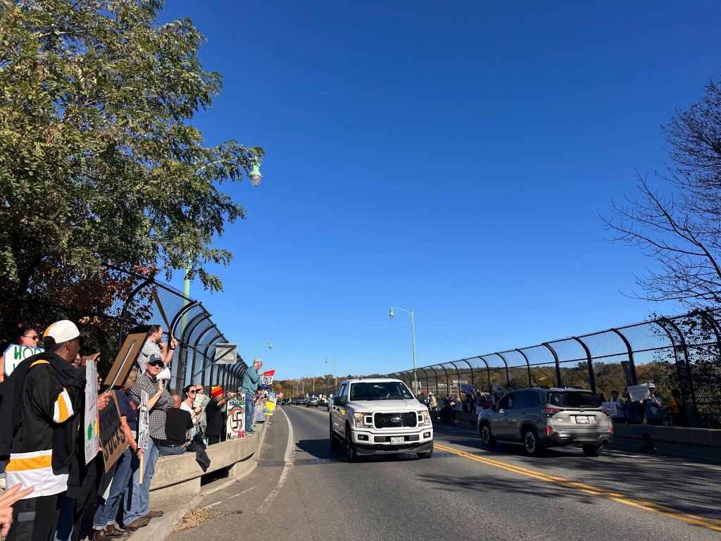 After traffic resumed, drivers honked horns, waved and threw up fists, met by cheers from the hundreds of protesters on either side of the bridge.