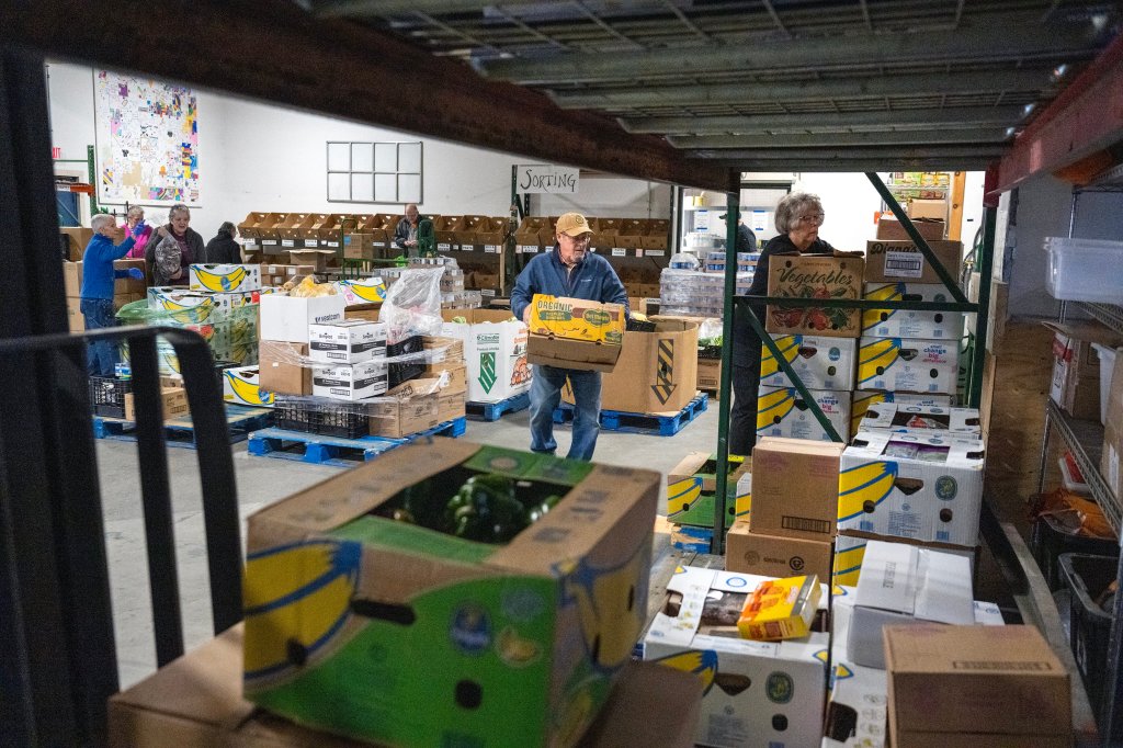 A small crew of volunteers scurry around the 8,000-square-foot warehouse, adding the newly delivered boxes to designated sections for produce, baked goods, meats. About eight representatives from four area food pantries look on, waiting for the morning shopping session to officially begin.
