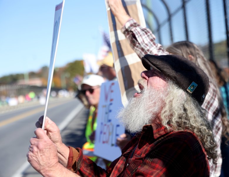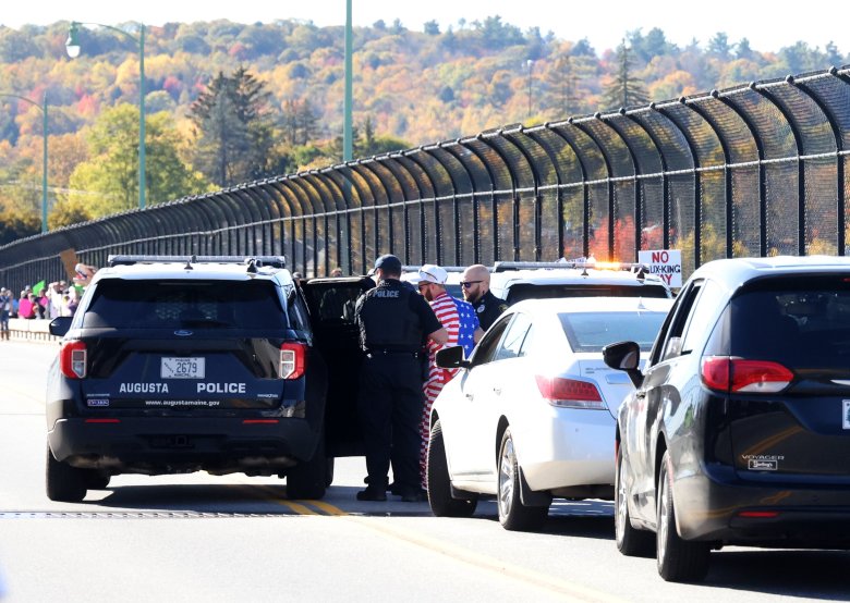 Saturday’s protests in Maine appeared to be mostly peaceful, though police were seen handcuffing a man counterprotesting on Augusta’s Memorial Bridge just before 2 p.m.