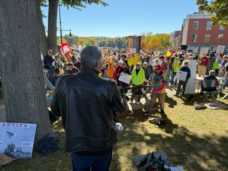 Participants in Waterville marched to Veteran’s Memorial Park beating drums, waving American flags and blowing horns. Jacob Madley, a student at Colby College, said he is not a “protest kind of guy” but came to speak out against the federal government.
